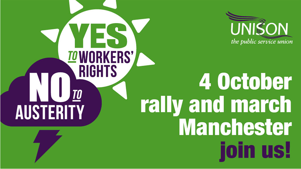 As the Conservative Party Conference meets in Manchester this year, thousands of trade union members and supporters will march through the city, taking a clear message to the party about its government’s damaging programme of austerity and attacks on the rights of working people and their unions. It will take place on Sunday 4 October and will begin with a march through central Manchester, culminating in a rally close to the Conservative Party conference. Programme for the day 12.00: Assemble Oxford Road from All Saints Park southwards 13.00: Opening rally 13.30: March through the city on a route that circles the Conference Centre, ending at Deansgate / Whitworth St for coach pick ups Further information Oct 4 Rally Poster TUC website